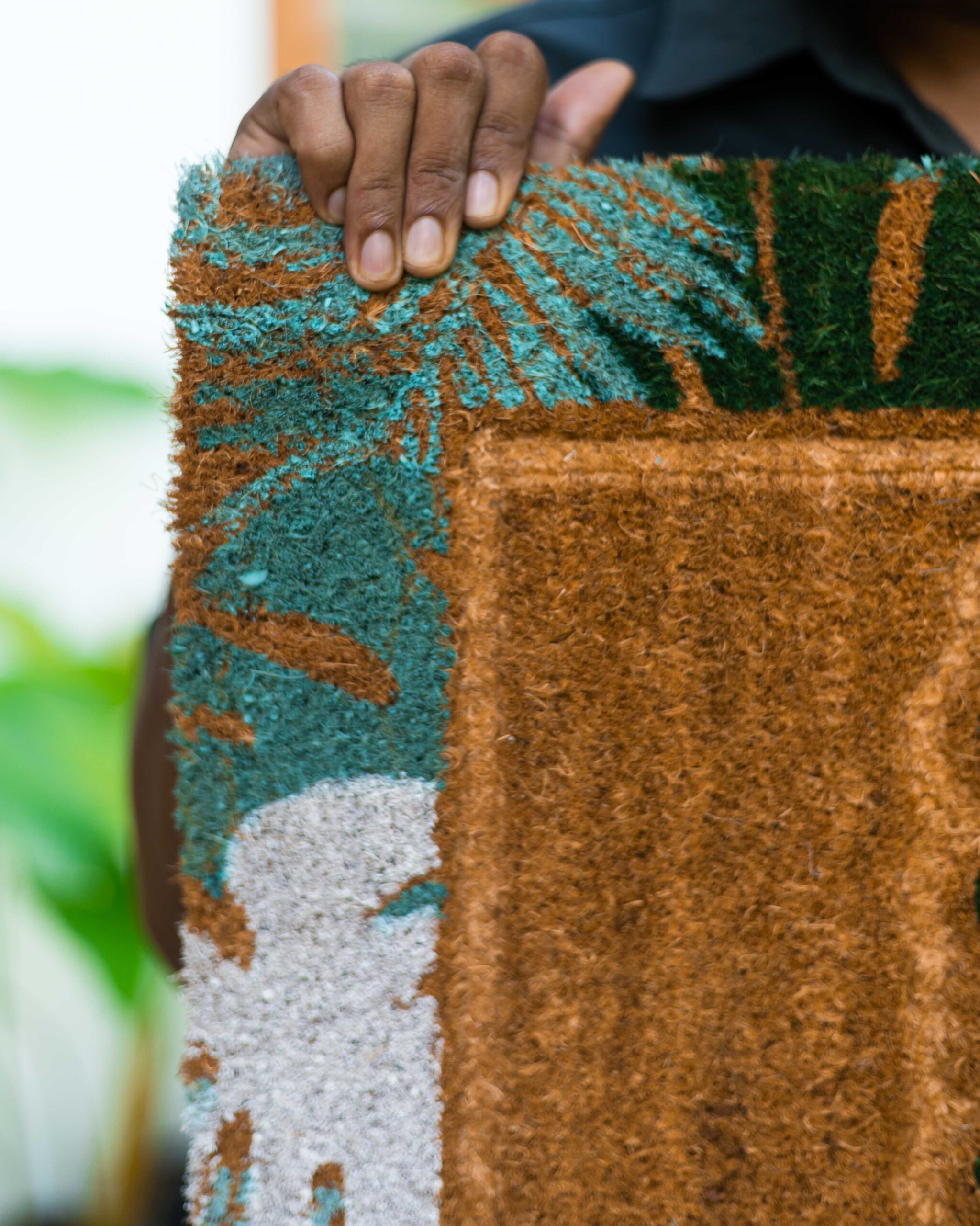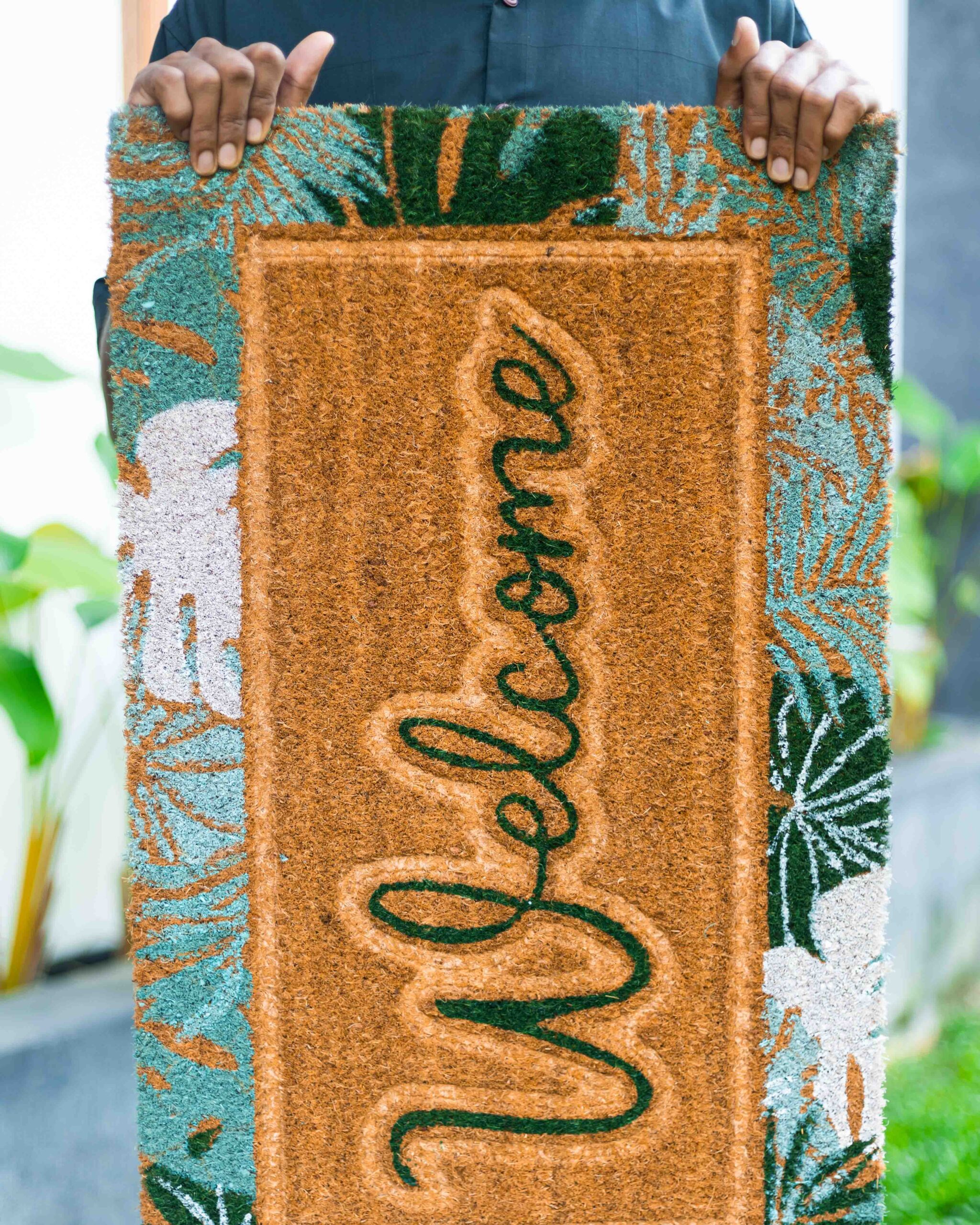 With long-lasting and fashionable house entrances, this elegant embossed welcome coir mat with a colorful printed border is made of natural coir and has an anti-skid PVC backing.