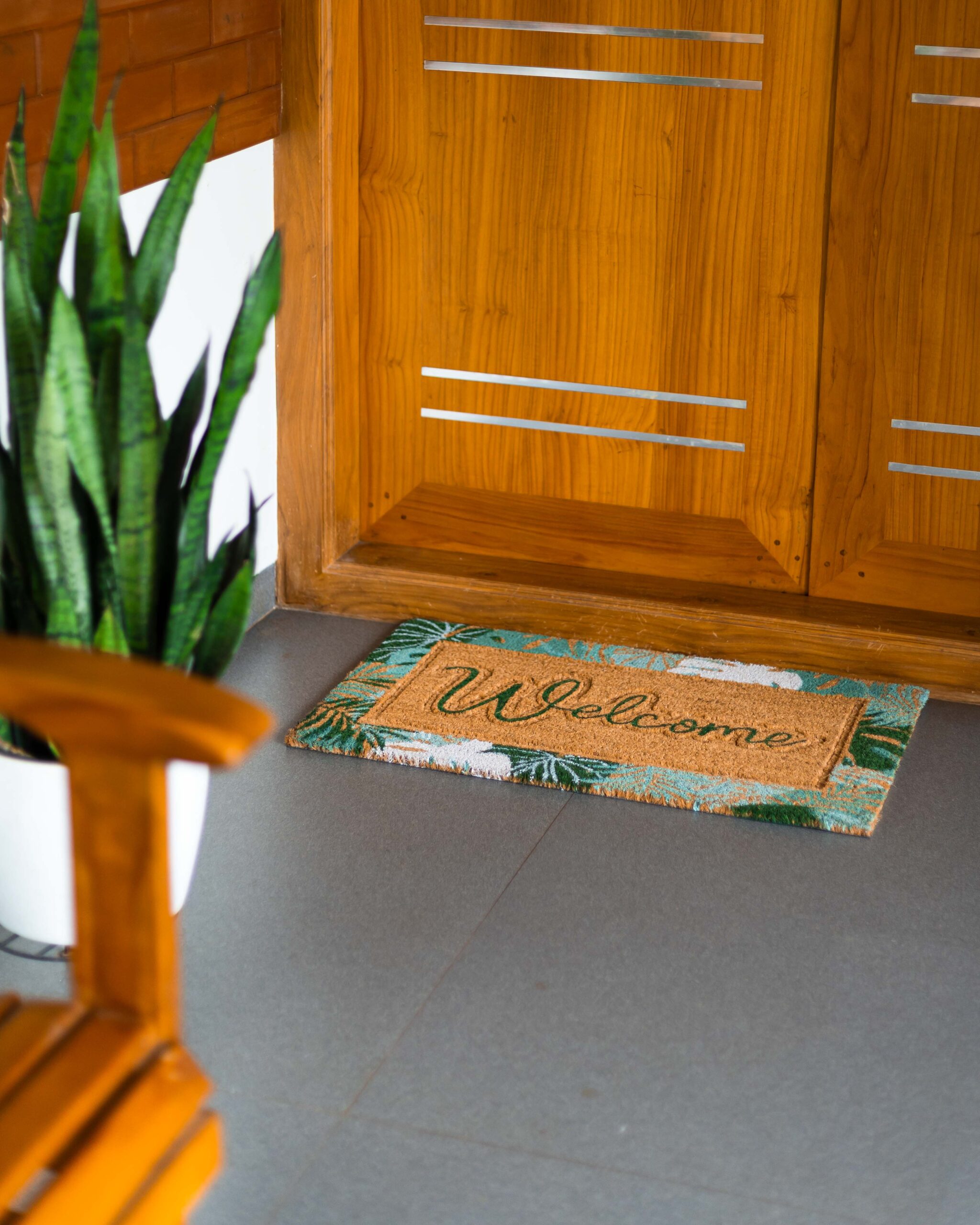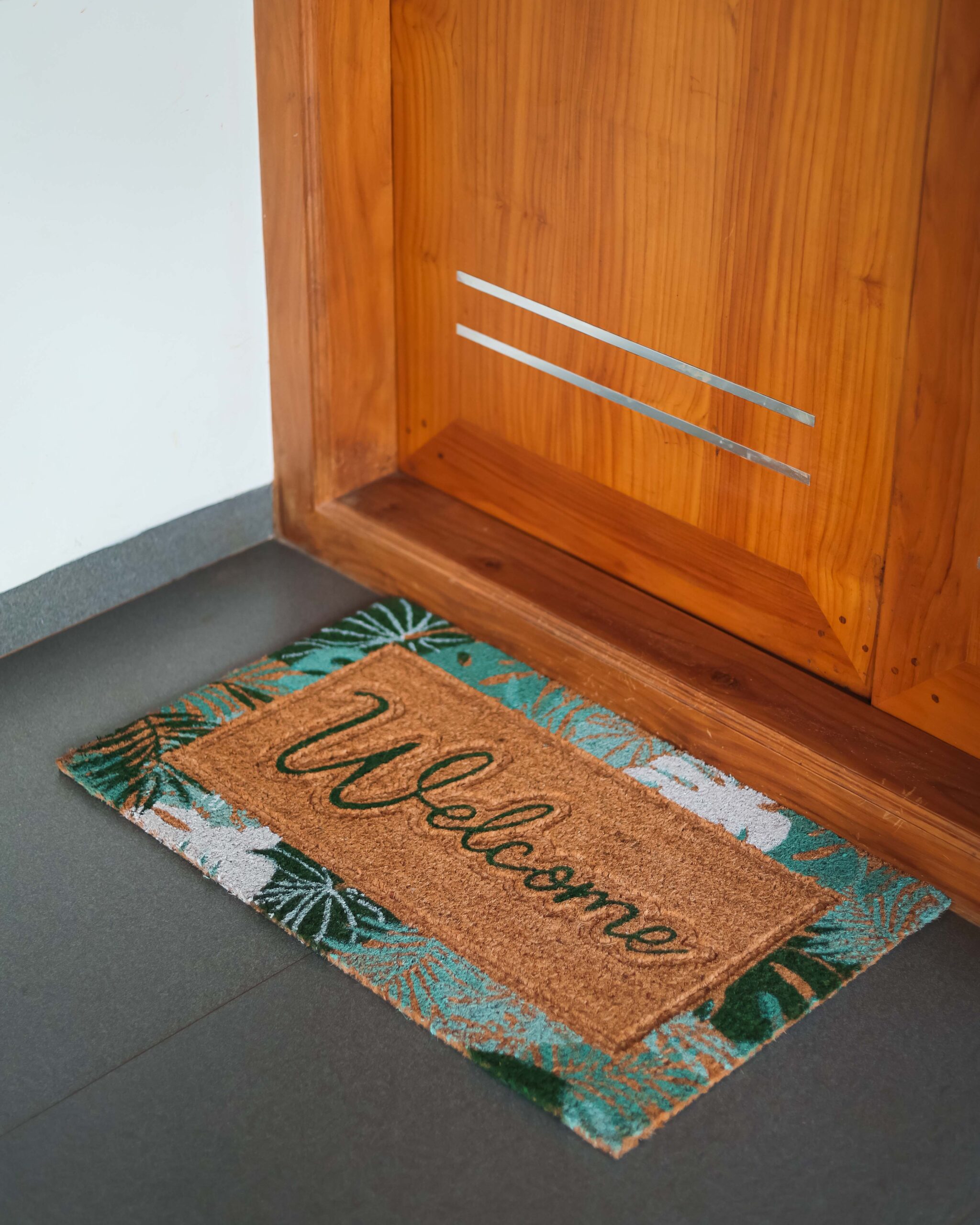 The mat has a modern decorative appearance that complements any doorfront décor thanks to its premium embossed "Welcome" writing in the center and its colorful leaf-printed border. Excellent grip is provided by the sturdy PVC backing, which keeps the mat firmly in place even with regular foot activity and prevents slides. This mat is long-lasting, environmentally safe, and simple to maintain just shake, brush, or vacuum—making it perfect for main entrances, balconies, verandas, patios, and inside entry areas.