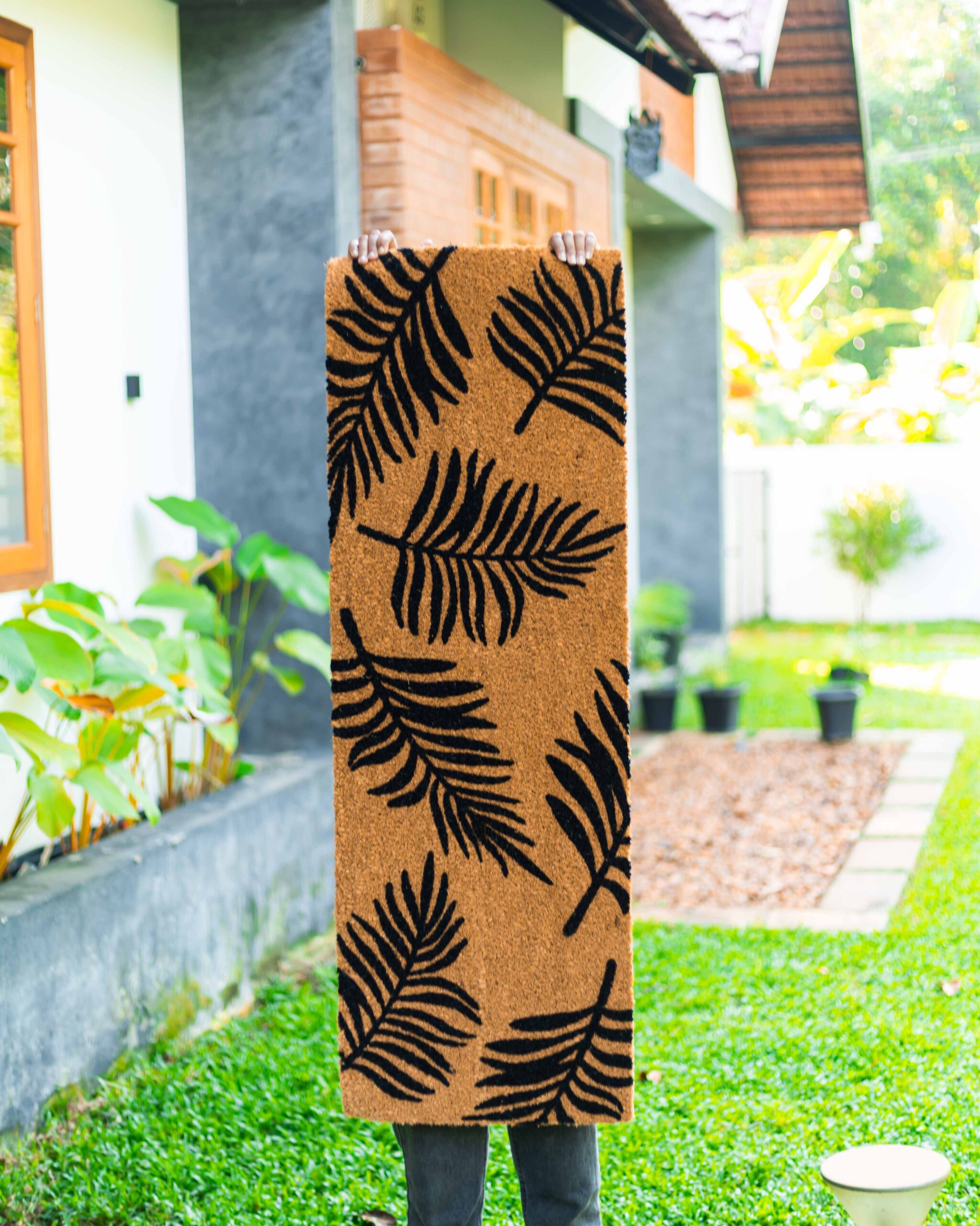 This black leaf printed coir runner mat is designed for indoor as well as semi-outdoor use. It performs well in areas exposed to outdoor elements such as dust, mud, or light moisture. Whether placed at the main door of your home, apartment entrance, office doorway, balcony entrance, or hallway, it provides reliable performance while maintaining its stylish appearance.