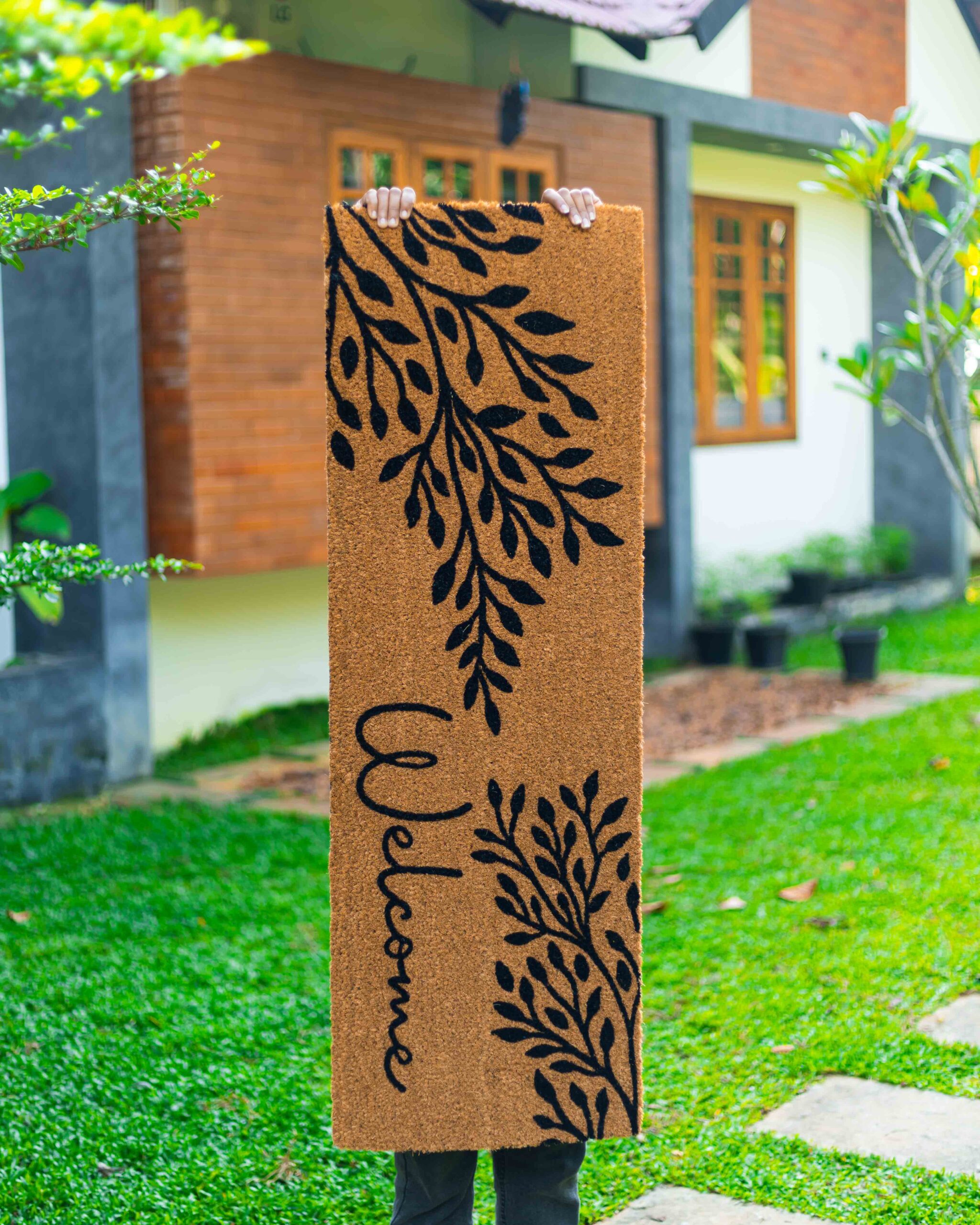 Constructed from high-quality natural coir, this mat offers exceptional strength and long-lasting performance. Coir is derived from coconut husk fibers and is known for its durability and natural dirt-scraping properties. The thick coir bristles effectively remove dust, mud, and debris from footwear, preventing dirt from being carried into your home. This helps keep indoor floors cleaner and reduces the need for frequent cleaning. The extra-long rectangular size of 40×120 cm provides excellent coverage compared to standard doormats. This larger size is especially suitable for wide entrances, double doors, balconies, verandas, patios, and hallways where additional wiping space is needed. The generous surface area allows multiple people to wipe their shoes comfortably, making it ideal for busy households or commercial spaces. Another advantage of this mat is its eco-friendly construction. Natural coir fibers are renewable, biodegradable, and environmentally sustainable. By choosing a coir mat, you are selecting a product that is both practical and environmentally responsible. The natural fibers also provide a textured surface that effectively traps dust and absorbs small amounts of moisture. The mat is designed for indoor as well as semi-outdoor use. It performs well in spaces such as home entrances, apartment doorways, balconies, verandas, patios, and office entry areas. Its strong coir construction allows it to handle everyday foot traffic while maintaining its shape and performance over time. Maintenance is simple and convenient. This Tree Design Coir Welcome Mat requires minimal effort to keep it looking fresh. You can easily clean the mat by shaking it outdoors, brushing away loose dirt, or vacuuming it occasionally. The durable coir fibers retain their structure even after repeated cleaning, ensuring long-lasting usability. Beyond its practical benefits, this mat also enhances the aesthetic appeal of your entrance. The artistic tree branch design adds a decorative element that complements natural and modern décor styles. Combined with the welcoming text, it creates an inviting atmosphere for anyone stepping into your home. Whether placed at the main door of your house, apartment entrance, shop entrance, or office doorway, this Coir Tree Design Printed Mat (40×120 cm) offers the perfect combination of durability, style, and functionality. Its natural coir construction, decorative design, large size, and easy maintenance make it a practical and elegant solution for maintaining a clean and welcoming entryway.